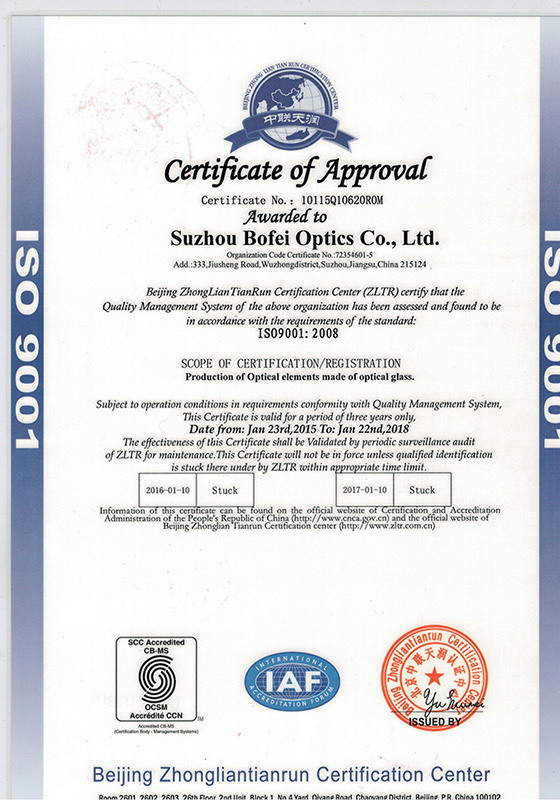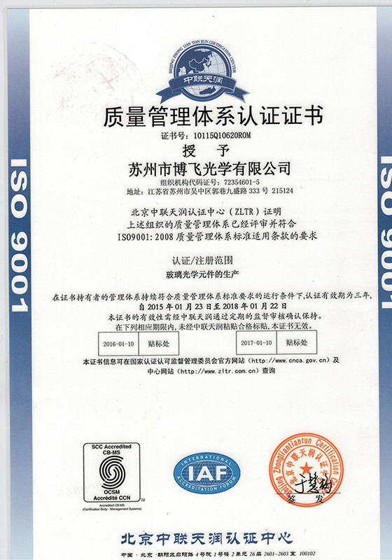 博飛光學(xué)通過ISO9001質(zhì)量管理體系自2008年開始進行質(zhì)量管理體系認(rèn)證。我們建立了嚴(yán)格的質(zhì)量管理體系,嚴(yán)格控制產(chǎn)品質(zhì)量,確保每一件產(chǎn)品都符合國際標(biāo)準(zhǔn),能夠提供優(yōu)良的光學(xué)性能。